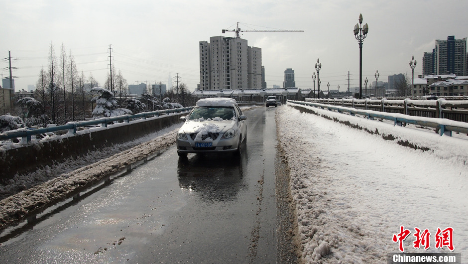 2月18日,蛇年首场瑞雪普降南京。2月19日清晨,南京长江大桥车道上的积雪被车辆碾过后,基本消失,也有部分车道上的雪被压成了冰盖。上午9点半,南京长江大桥较为畅通,往来车辆比平时要少很多,由于大雪消融导致路面湿滑,过往车辆纷纷减速行驶。中新社发 黄鹂 摄
