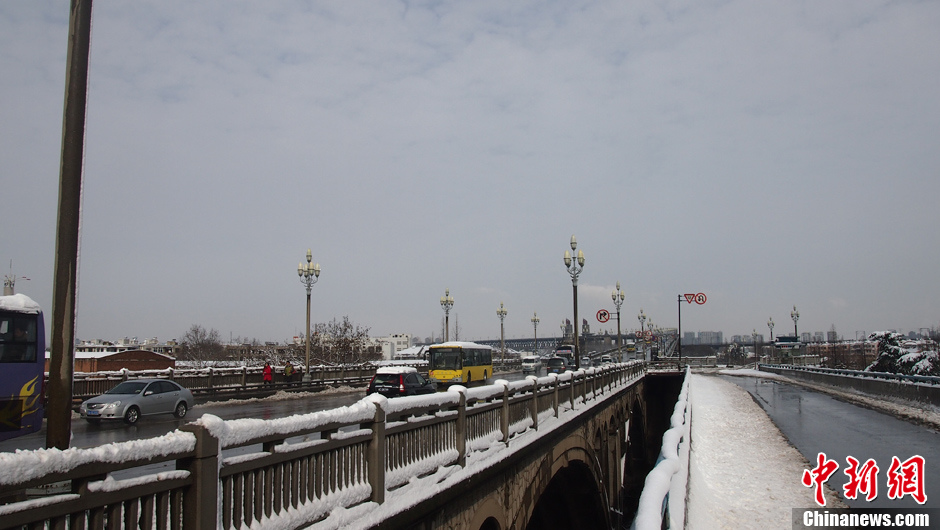 大雪消融致南京长江大桥路面湿滑 车辆减速行驶