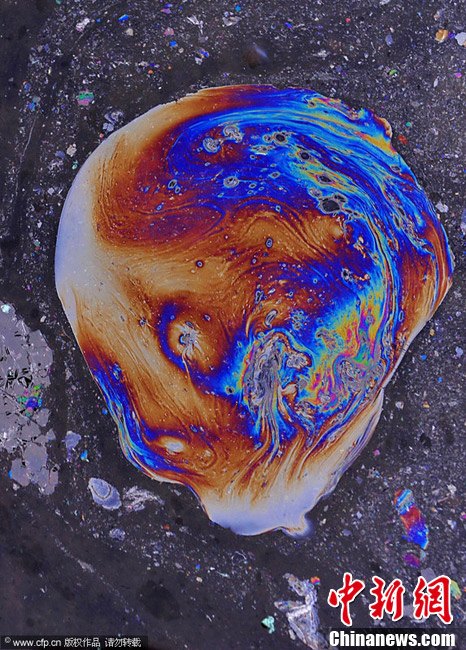 2011年2月24日,贵州乌江大坝水面上漂浮着的油污。乌江镇河段被严重污染。图片来源:CFP视觉中国