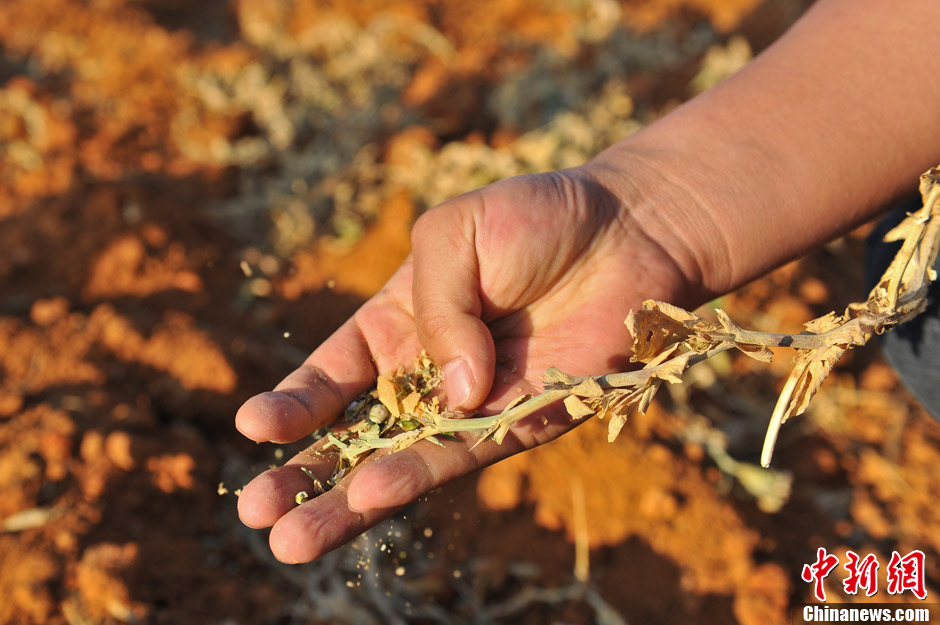 2月20日,云南省楚雄州永仁县已120多天未降雨,加上自2009年开始,连续干旱,导致土地里的耐旱作物豌豆颗粒无收,枯死的豌豆用手轻轻一捻就粉碎,村民只能收割后拿去喂猪。据了解,目前干旱已造成云南省60.4万人、33.5万头大牲畜出现不同程度饮水困难。中新社发 任东 摄