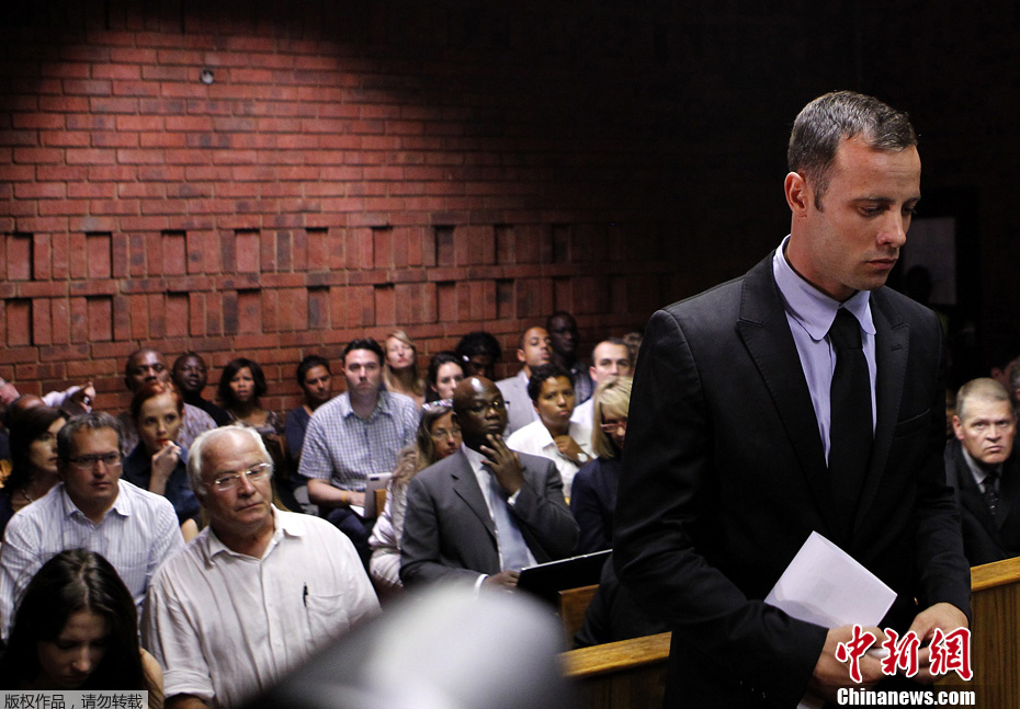 当地时间2013年2月20日,南非行政首都比勒陀利亚,刀锋战士奥斯卡-皮斯托瑞斯第三次出庭受审。南非警方20日表示反对涉嫌枪杀女友的“刀锋战士”皮斯托瑞斯获得保释。