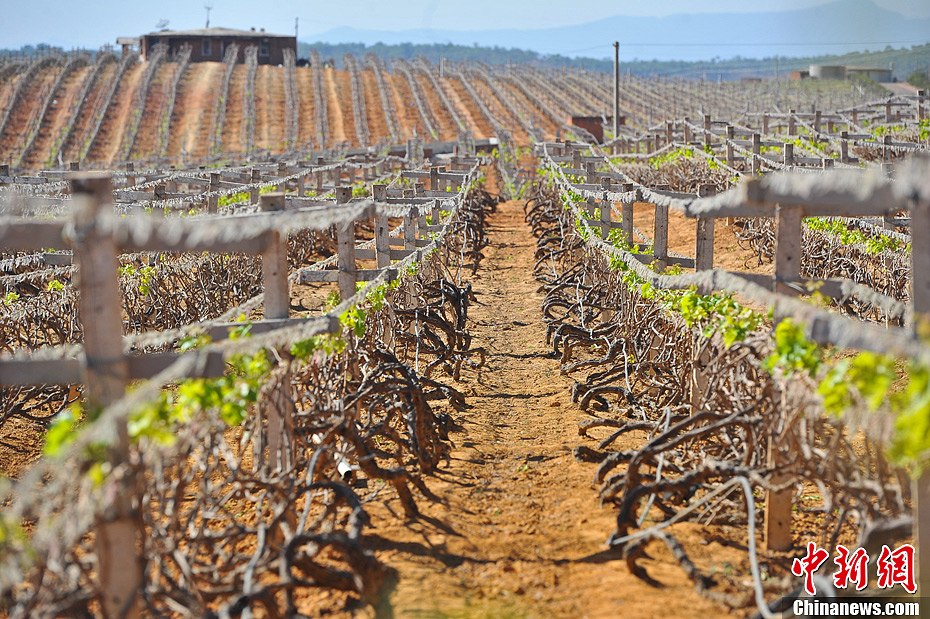 2月21日,云南省楚雄州永仁县用“滴灌”技术种植耐旱的油橄榄和葡萄,把水管道直接插入植物蓄水的根部以节约用水。据了解,因连年的干旱,当地转变生产模式,新兴种了上万亩油橄榄和葡萄等耐旱作物。这些耐旱的经济作物每年可以节约200多万方水,节水率达到70%以上。楚雄正遭受着连续5年的干旱,许多村庄出现不同程度的用水困难。图为用滴灌技术种植的葡萄。中新社发 任东 摄