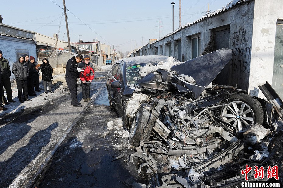 2月21日中午12许时,哈尔滨市道外区联合街亚泰水泥厂走行线道口发生一起火车(货运列车)和一辆“宝马”轿车相撞事故,无人员伤亡。具体事故原因正在调查中。图为相关人员在测量事故现场。中新社发 刘长山 摄