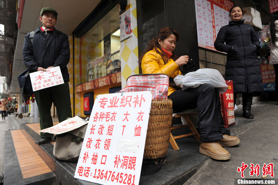 2月21日,重庆街道上随处可看到大批农民工携带着自己的“谋生工具”摆摊求职。很多农民把自己会做的工作写在广告纸上,提着木锯、锤子、钢钎、粉刷球等工具,等待雇主。图为一农民工正在为顾客织补。陈超 摄