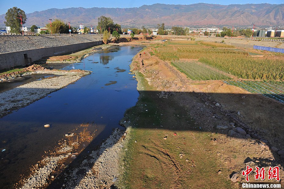 2月21日,位于云南省楚雄州元谋县境内的龙川江因旱大面积缩水,几近断流,河床变菜地。龙川江为金沙江南岸一级支流,在元谋县北部汇入金沙江。图为原先河床的一半缩水后都成了菜地。任东 摄