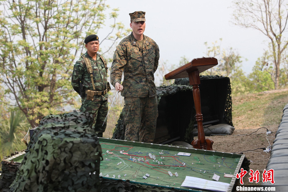 2013“金色眼镜蛇”美泰联合军事演习,2月21日在泰国北部素可泰府班达蓝霍地区进行最后一场实弹射击演习后落幕。美方参演部队指挥员在沙盘上讲解当天的演习科目。中新社发 余显伦 摄