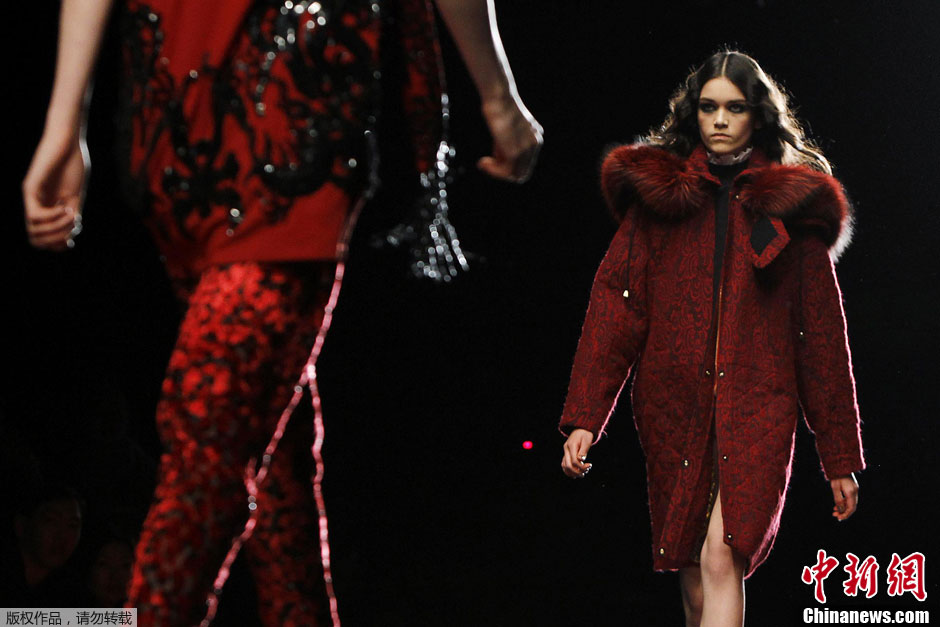 当地时间2月21日,意大利米兰,2013米兰秋冬时装周,模特T台走秀进行展示。