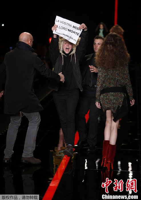 当地时间2月21日,意大利米兰,2013米兰秋冬时装周品牌皮草秀场,一位反皮草组织的成员举着字幅走上T台进行抗议,随即被保安带走。