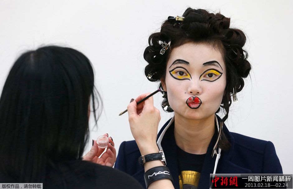 当地时间2月17日,英国伦敦,2013伦敦秋冬时装周,即将登台的模特在后台进行面部彩绘。