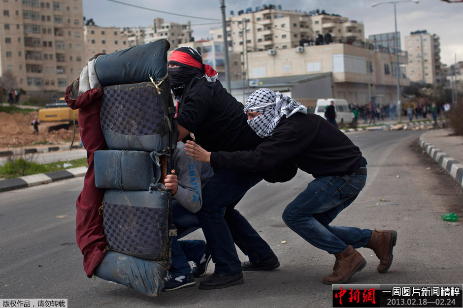 2月19日,约旦河西岸城市拉姆安拉附近,巴勒斯坦人在奥弗(Ofer)以色列军事监狱外举行了抗议集会,支持四名正在进行绝食抗议的被囚同胞,并和以色列士兵发生冲突。图为抗议中,头戴面罩的巴勒斯坦人将汽车座椅用作掩体。