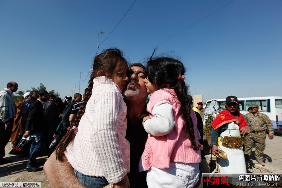 2月21日,伊拉克巴格达al-Rusafa监狱外,一名获释的被拘留者抱着他的两个女儿。伊拉克政府当天释放了200多名囚犯,试图安抚逊尼派穆斯林示威者。示威者正在举行抗议,反对该国总理什叶派穆斯林马利基(Nouri al-Maliki)。