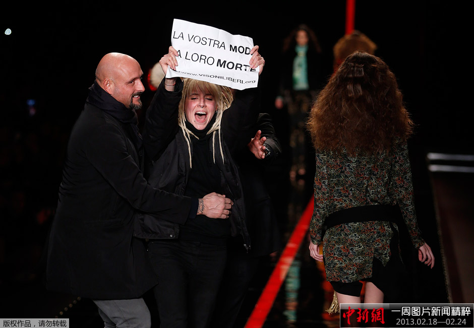 2月21日,意大利米兰,2013米兰秋冬时装周品牌皮草秀场,一位反皮草组织的成员举着字幅走上T台进行抗议,随即被保安带走。