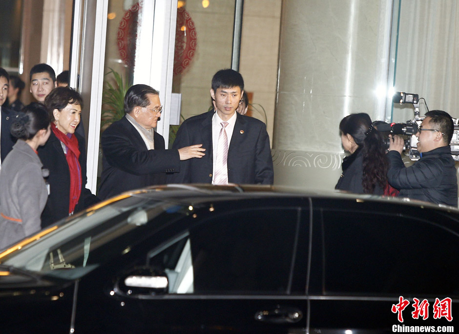 2月24日晚,国民党荣誉主席连战抵达北京首都机场,图为他和夫人走出贵宾楼。中新社发 张浩 摄