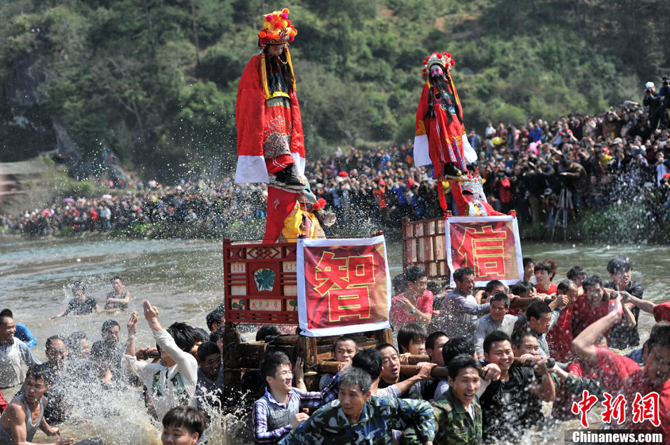 2月23日,中国传统元宵佳节,福建连城罗坊乡客家民众“走古事”闹元宵。图为走古事在河里你追我赶,竞争激烈。吕明 摄