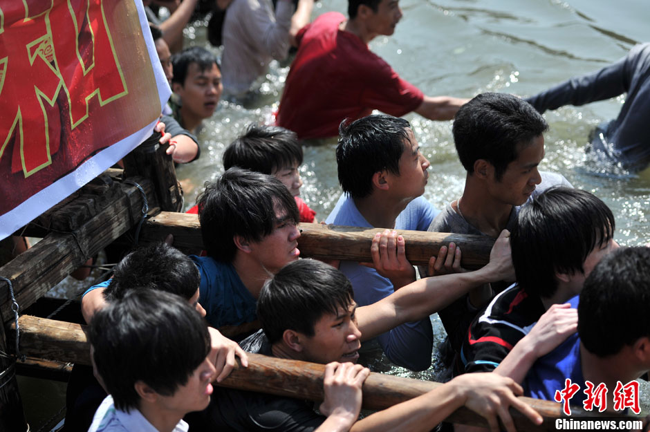 2月23日,中国传统元宵佳节,福建连城罗坊乡客家民众“走古事”闹元宵。图为抬夫不惧寒冷在水里走古事。吕明 摄