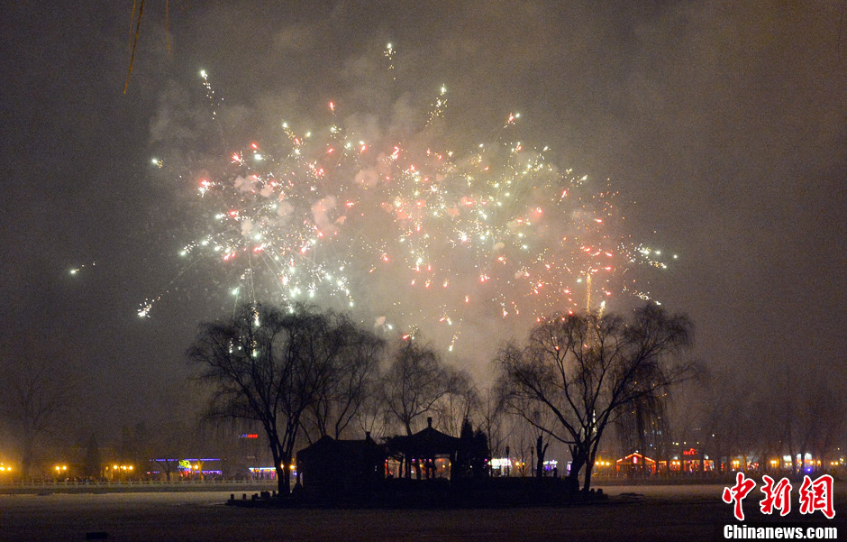 2月24日是农历正月十五,中国传统节日元宵节,北京再现雾霾天,晚上大量燃放的烟花爆竹又加剧了空气污染。图为北京后海周边,大量燃放的烟花爆竹使空气能见度大大降低。中新社发 刘震 摄