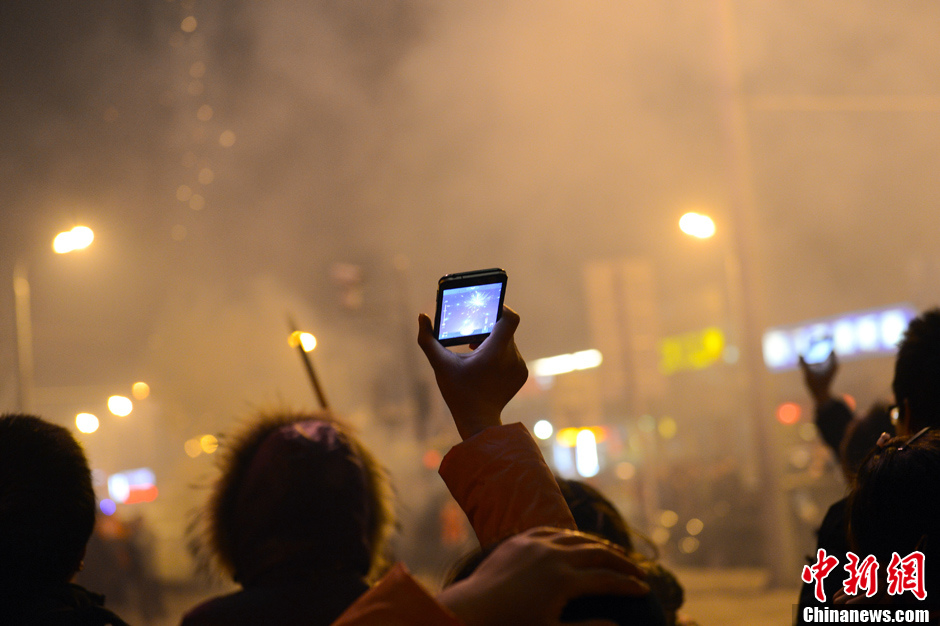 2月24日是农历正月十五,中国传统节日元宵节,北京再现雾霾天,晚上大量燃放的烟花爆竹又加剧了空气污染。图为北京后海周边,市民用手机拍摄烟花,烟花燃放后产生的大量烟雾使空气变得刺激难闻。中新社发 刘震 摄