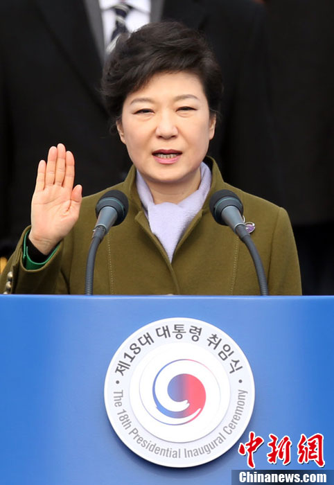 当地时间2月25日,韩国首尔,韩国首位女总统朴槿惠在就任仪式上宣誓就职。图片来源:CFP视觉中国