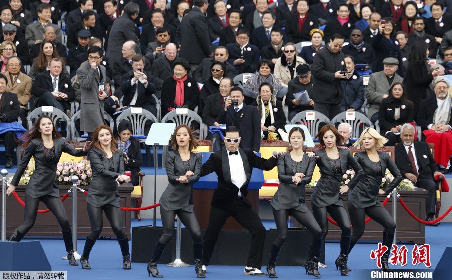 当地时间2013年2月25日,韩国首尔,韩国新任总统朴槿惠的就职仪式在韩国国会议事堂前院举行,PSY演唱代表21世纪的《冠军》和《江南Style》助阵。