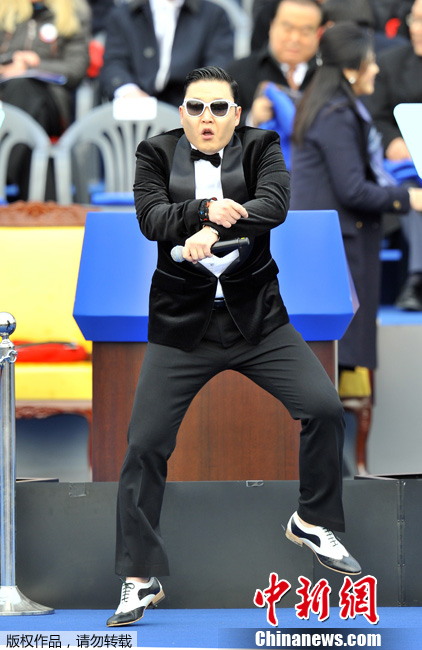 当地时间2013年2月25日,韩国首尔,韩国新任总统朴槿惠的就职仪式在韩国国会议事堂前院举行,PSY演唱代表21世纪的《冠军》和《江南Style》助阵。