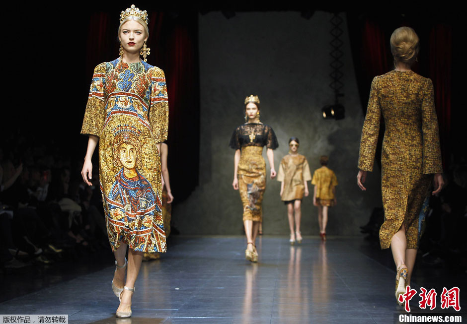 当地时间2月24日,意大利米兰,2013米兰秋冬时装周,模特T台走秀进行展示。