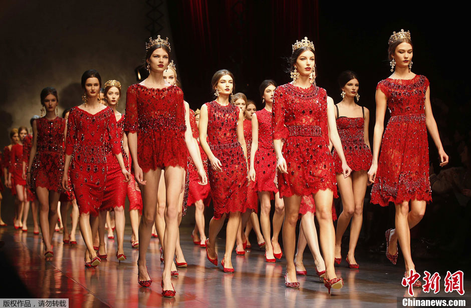 当地时间2月24日,意大利米兰,2013米兰秋冬时装周,模特T台走秀进行展示。