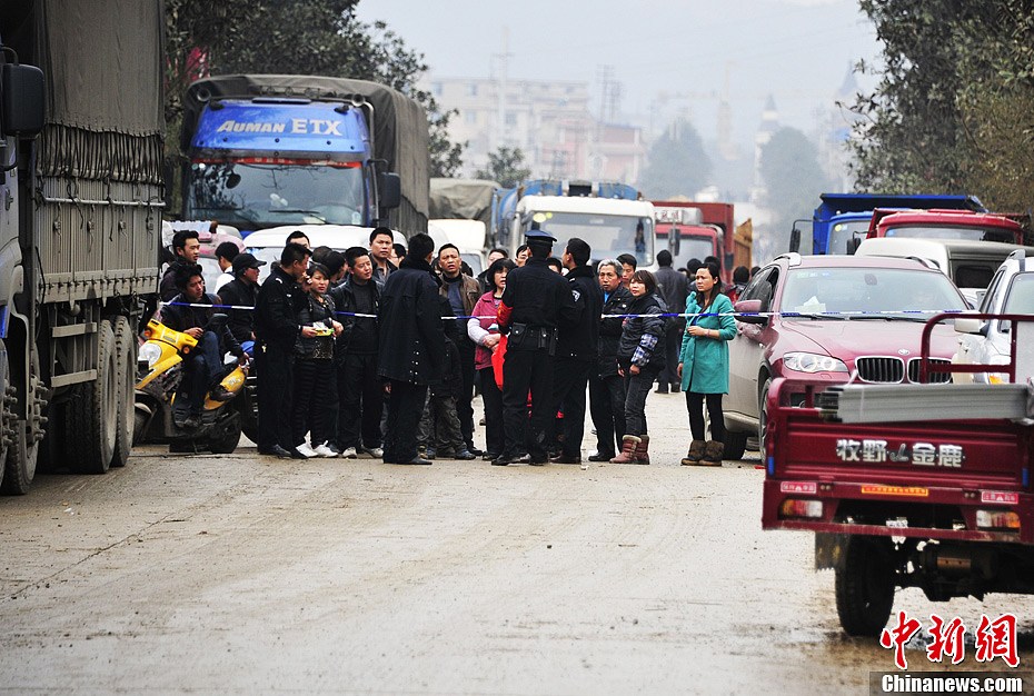 2月25日,贵阳市白云区麦架镇的柏丝特化工有限公司一生产车间发生原材料泄漏燃烧事故,目前已造成该厂5名员工受伤,近3万名民众转移。图为警察在现场设置警戒,疏散附近群众。 中新社发 李克 摄