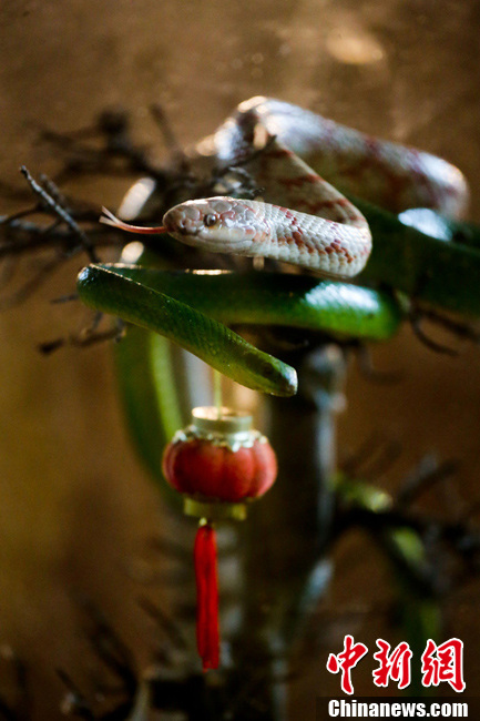 今年是蛇年,杨洪昌特地在蛇笼里挂上红灯笼,预兆着“蛇村”新年大吉。Zhangrq 摄 图片来源:东方IC 版权作品 请勿转载