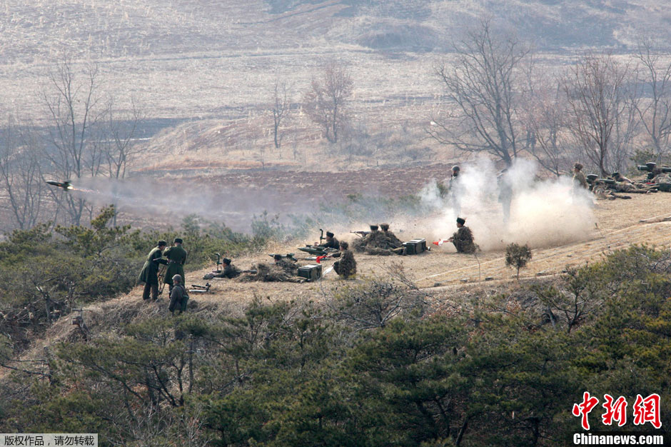 据朝中社2月25日报道,朝鲜最高领导人金正恩下令进行炮兵火力打击训练以检查朝鲜炮兵部队的实战能力,并到现场指导训练。图为朝鲜人民军炮兵正在进行火力打击训练。