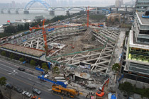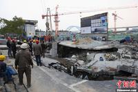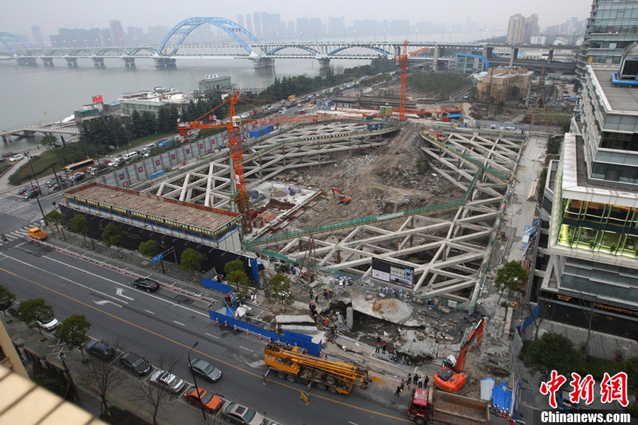 2013年2月25日中午,杭州飞云江路和之江路交叉路口突然出现路面塌陷。塌陷地点位于一写字楼施工工地大门口,靠近钱塘江边,西侧就是高耸的赞成大厦。塌陷面积长约30米、宽约20米,造成慢车道上整个路面下陷,塌陷造成的坑最深处有5米,周围凌乱地布满了大石块。赞成 摄 图片来源:东方IC 版权作品 请勿转载