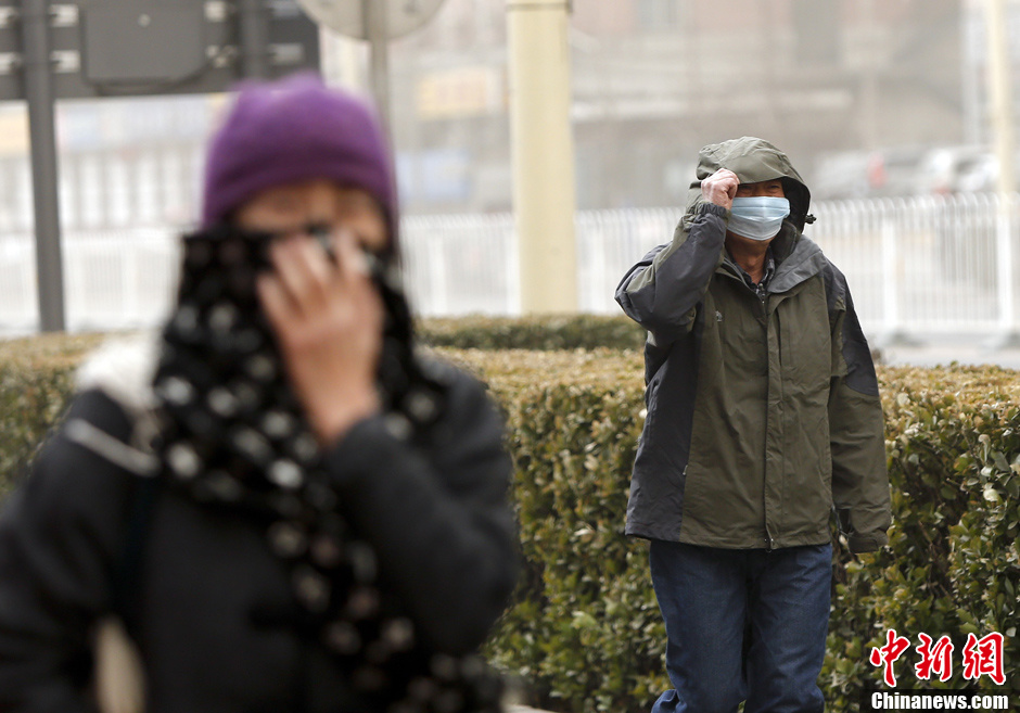 2月28日晨,北京西站前两位带着口罩的市民正在受北风困扰。当日早晨北京的天空再次被雾霾笼罩,全城多地空气质量再达严重污染级别。好在受冷空气影响,当天将有六七级北风来京“救急”,重污染过程不会持续太久。不过,北风吹起了沙尘,仍对市民出行产生了一定影响。中新社发 张浩 摄