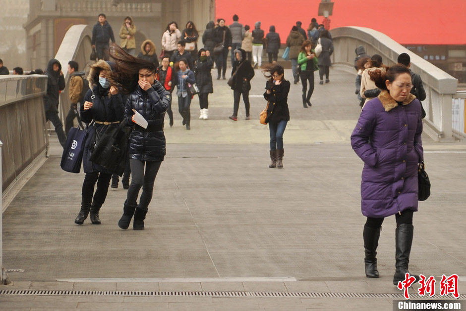 2月28日,北京城上空仍然雾霾弥漫、空气污浊,市气象局连续发布霾黄色预警及大风蓝色预警。京开、京沪、京平等高速都进行了不同程度的封闭。当日,大风将街头型男靓女秀发吹散在空中飞扬。中新网记者 金硕 摄