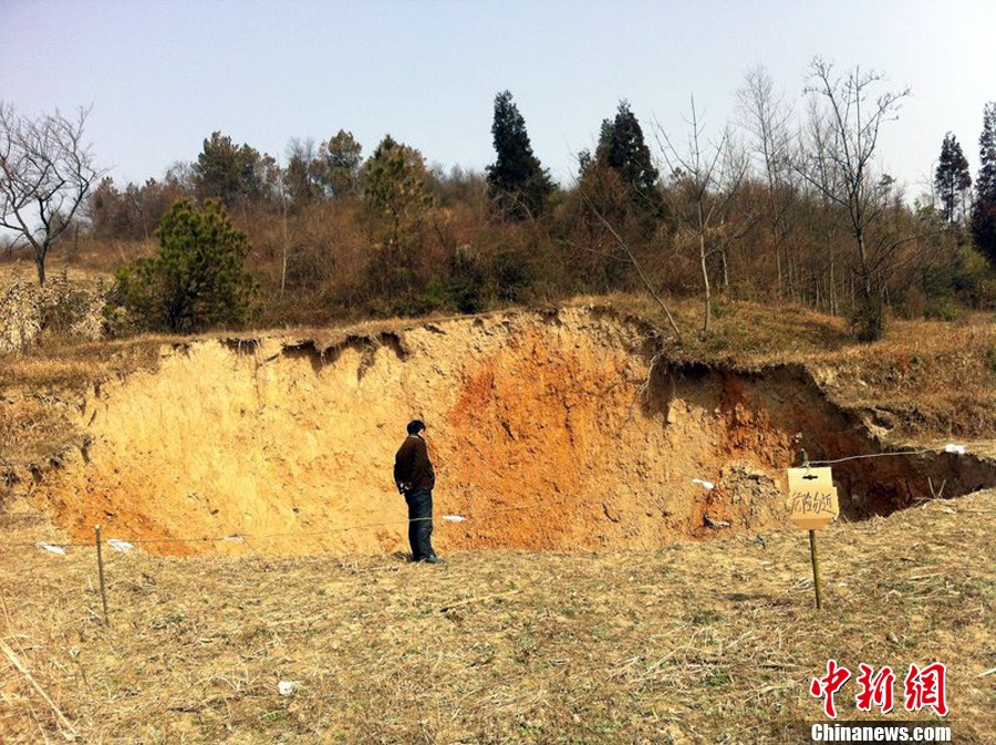 2012年9月的一个夜晚,一阵土石碰撞的“隆隆”声,让广元利州区工农镇三颗村6组的村民黄大金感到惊奇,拴在房屋外边的黄牛也叫了一整夜。第二天才发现“隆隆”声正是地陷的声音,在黄牛旁边出现了一个小“坑”。接下来的几天,“隆隆”声始终不断,6昼夜后,原有的小坑变成了直径近20米,深不见底的“天坑”。 “轰隆隆隆……响了几天。”