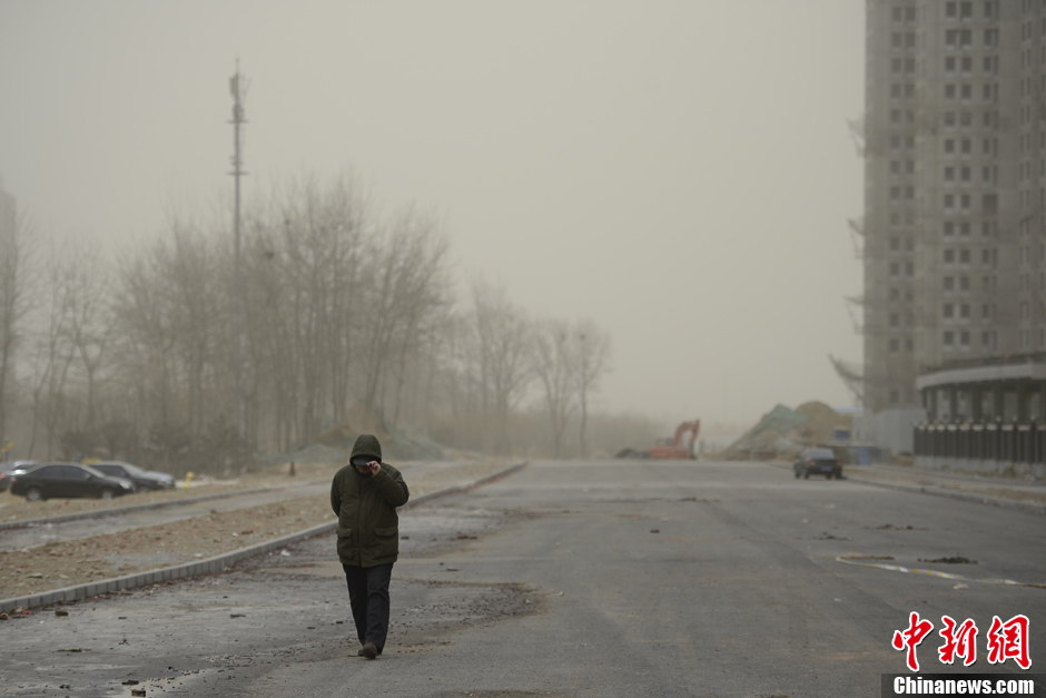 2月28日,北京出现雾霾沙尘天气,并伴有大风,空气质量下降,污染严重。中新社发 侯宇 摄
