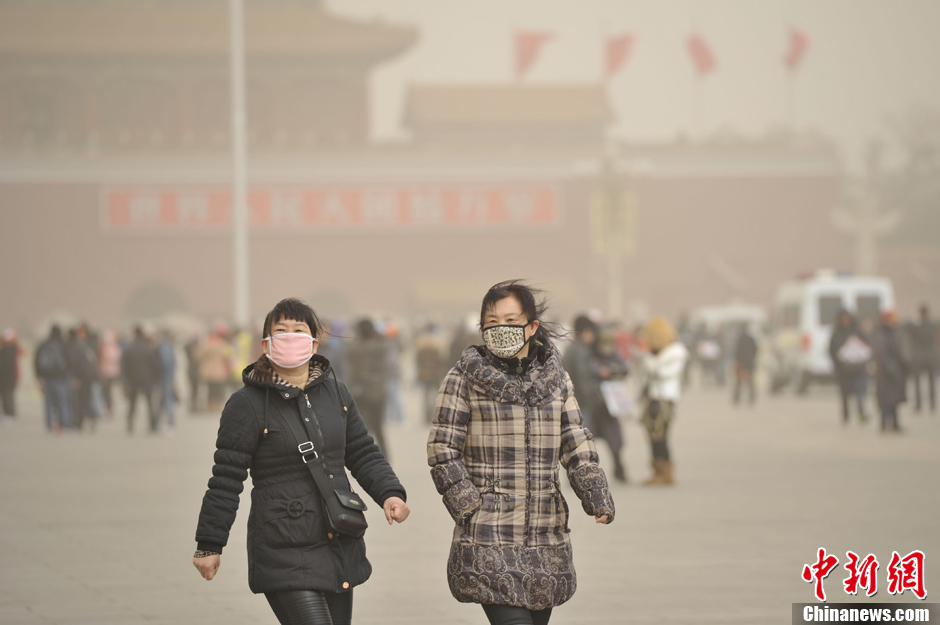 2月28日,游客在天安门广场游览。北京当日再次遭遇严重雾霾天,空气污染严重,能见度差。中午刮起六七级北风,并伴有沙尘。中新社发 韦亮 摄