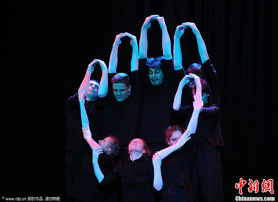 当地时间2013年2月26日,俄罗斯圣彼得堡,黑衣表演者参加手艺术剧院表演,表演剧目名为“玩乐时间”。表演者用哑剧的方式,利用手和手臂进行艺术表现。图片来源:CFP视觉中国