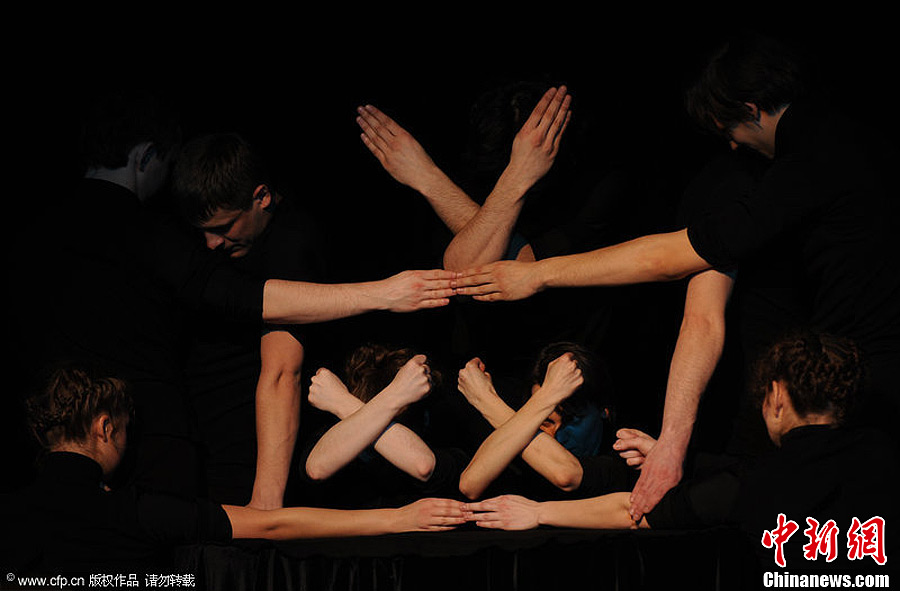 当地时间2013年2月26日,俄罗斯圣彼得堡,黑衣表演者参加手艺术剧院表演,表演剧目名为“玩乐时间”。表演者用哑剧的方式,利用手和手臂进行艺术表现。图片来源:CFP视觉中国
