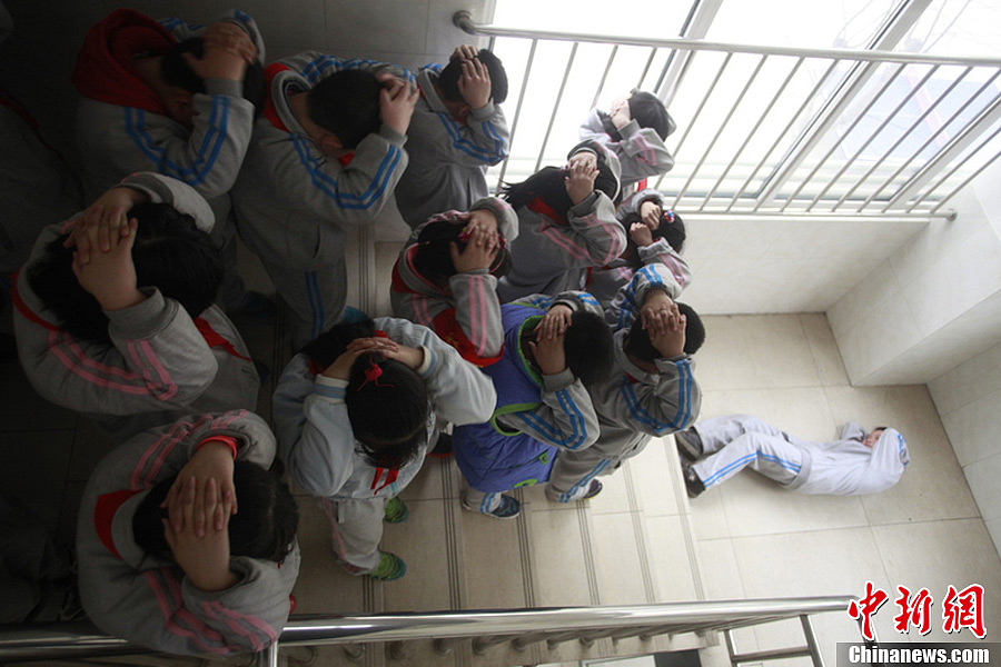2月28日,山东济南行知小学操场上,600多名学生在老师的指导下,进行踩踏事故演练,老师支招“抱头”来自救。据了解,2月27日,湖北襄阳老河口市薛集镇秦集小学发生一起因拥挤引起的踩踏事件后。济南行知小学进行了防止踩踏事故演练,强化了全体师生的安全意识,提高了突发事件应急处理和逃生自救。陈宁 摄 图片来源:东方IC 版权作品 请勿转载