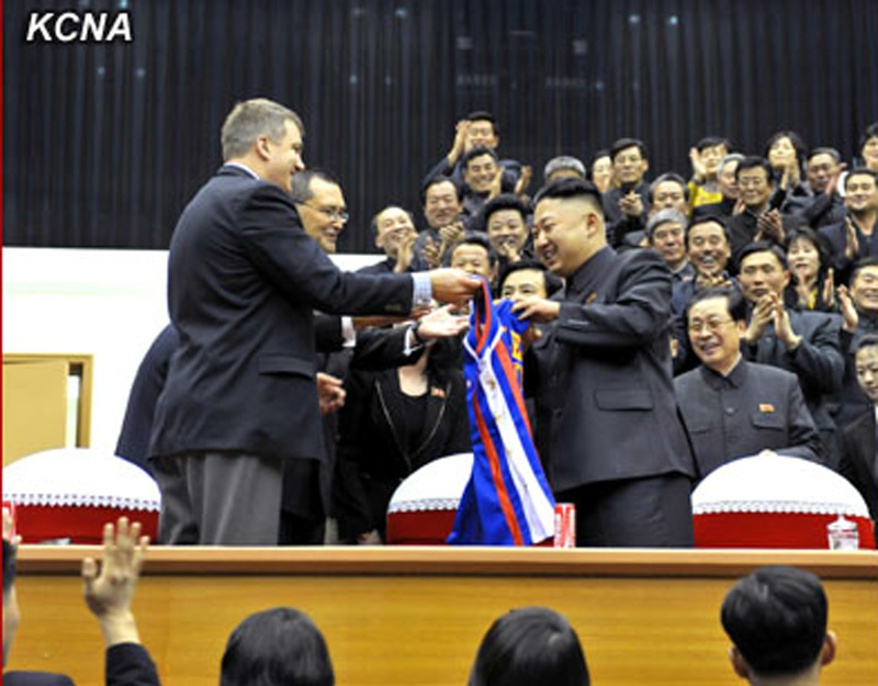 朝鲜和美国两国篮球选手2月28日在平壤柳京郑周永体育馆举行篮球赛。朝鲜最高领导人金正恩偕夫人李雪主来到赛场,与来访的美国全国篮球协会(NBA)前球星丹尼斯·罗德曼并排就坐在主看台中央观看比赛。比赛以110分比110分打成平局。比赛结束后,朝鲜体育大学向哈林花式篮球队赠送锦旗。图片来源:朝中社