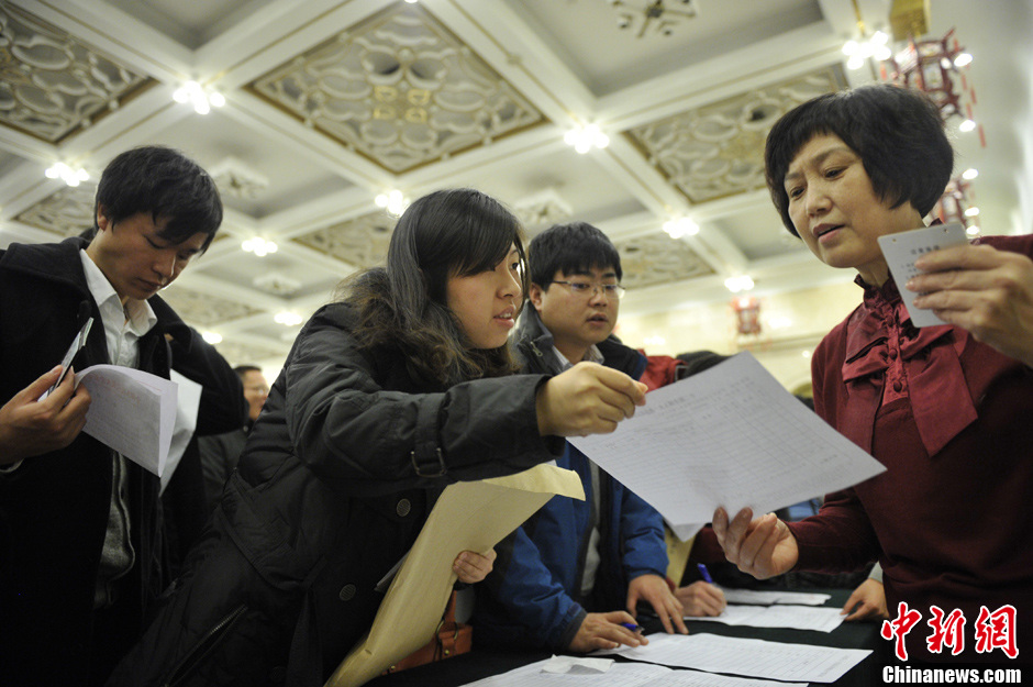 3月1日,工作人员在北京人民大会堂发放十二届全国人大一次会议采访证。随着2013年全国两会开幕在即,一年一度的新闻大战即将展开。中新社发 韦亮 摄