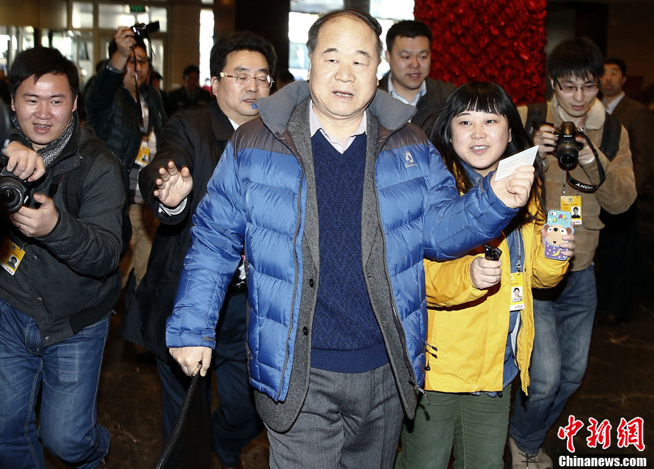 3月1日,新任全国政协委员、诺贝尔文学奖得主莫言现身政协驻地酒店,面对众多记者追问,他只说了一句“辛苦了!”中新社发 张浩 摄