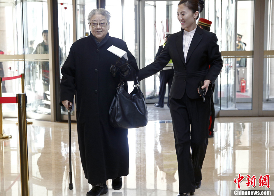 3月1日,全国政协委员、京剧表演艺术家李世济拄拐到政协驻地酒店报到,今年她已是80岁高龄。中新社发 张浩 摄