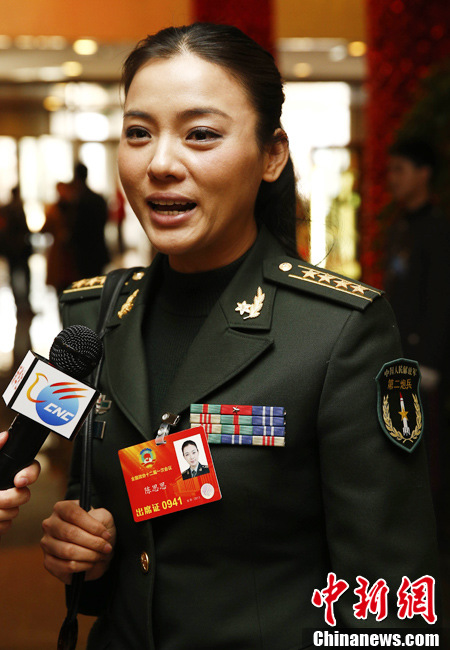 3月1日,全国政协委员、军旅歌手陈思思现身政协驻地酒店,她在接受记者采访时表示自己近来很关注网络反腐话题。中新社发 张浩 摄