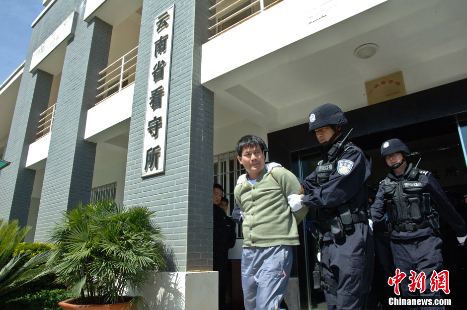 3月1日,根据最高人民法院院长签发的执行死刑命令,云南省昆明市中级人民法院依法对糯康、桑康·乍萨、依莱、扎西卡四名湄公河案罪犯执行了死刑。图为糯康被带出云南省看守所前往行刑地点。中新社发 张浩林 摄