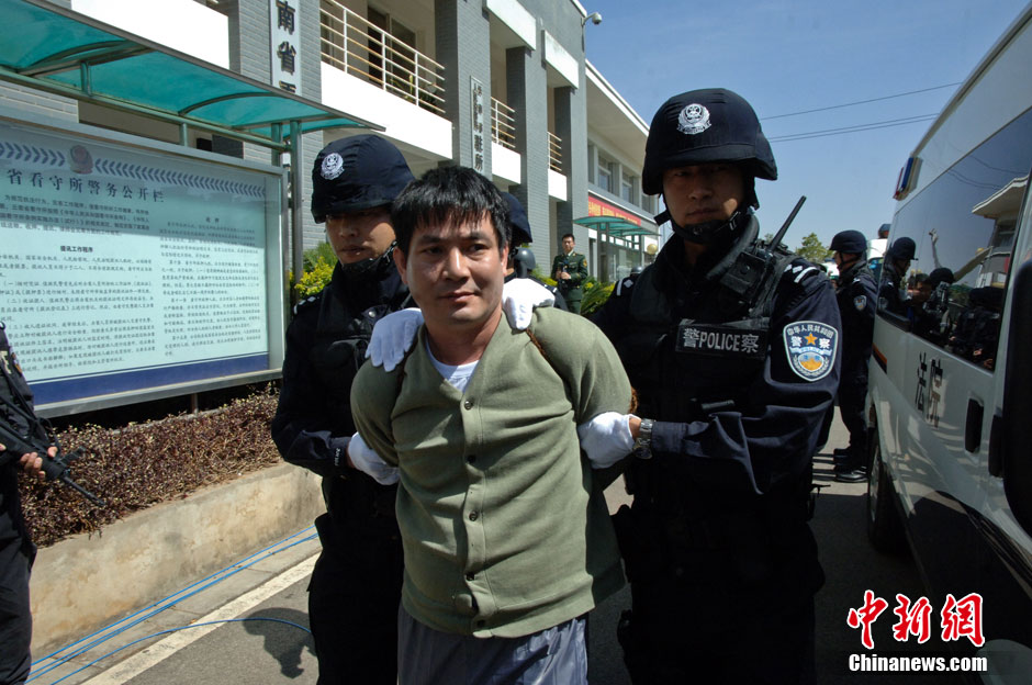 3月1日,根据最高人民法院院长签发的执行死刑命令,云南省昆明市中级人民法院依法对糯康、桑康·乍萨、依莱、扎西卡四名湄公河案罪犯执行了死刑。图为糯康被带出云南省看守所前往行刑地点。中新社发 张浩林 摄