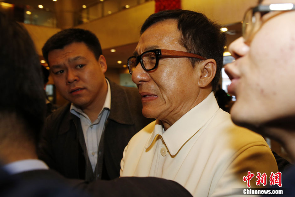 3月1日,全国政协委员、电影明星成龙到政协驻地报到,被迅速围上来的记者“吓到”,露出无奈的表情。 中新社发 刘关关 摄
