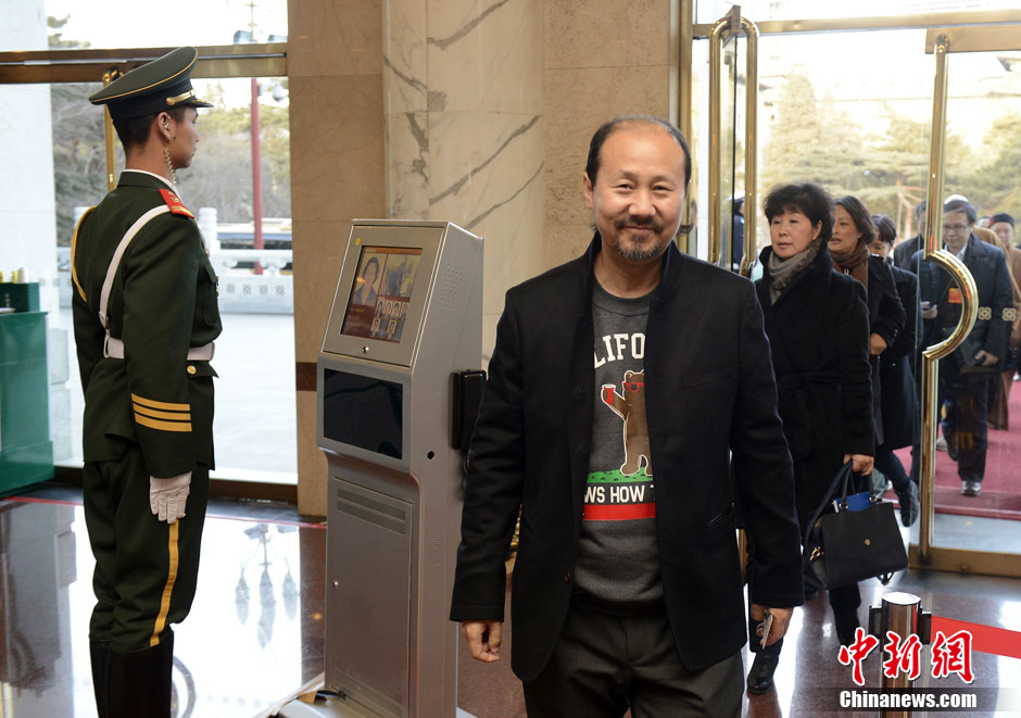 3月1日,全国政协委员、著名蒙古族歌手腾格尔抵达驻地。中新社发 侯宇 摄