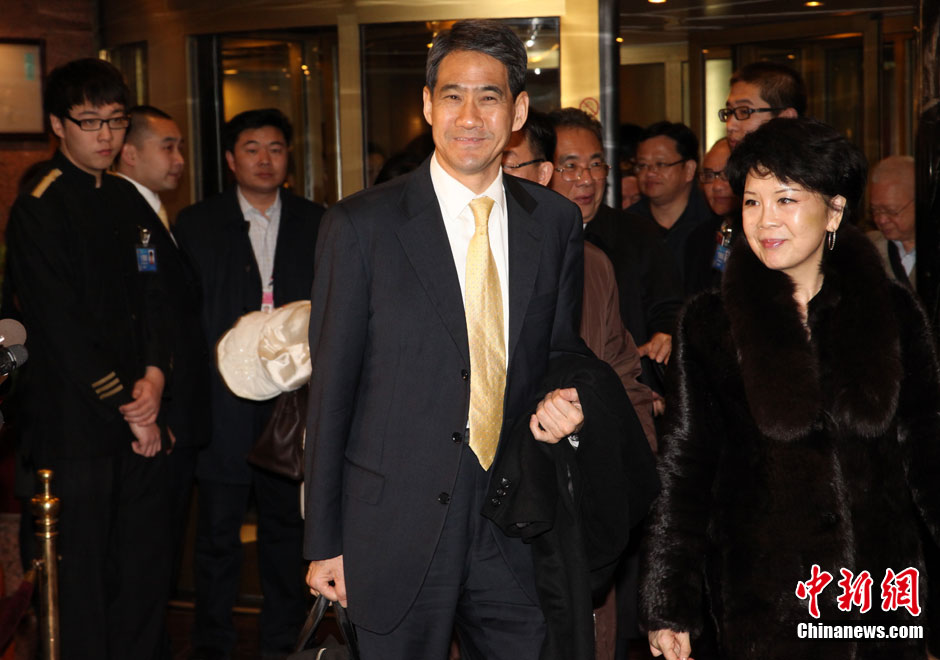 3月1日,全国政协委员、前香港警务处处长邓竟成(中)与参加全国政协第十二届第一次会议的部分香港委员抵达政协委员驻地。中新社发 陈小愿 摄