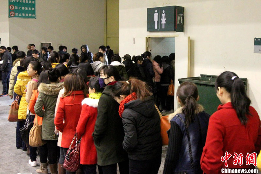 2013年3月2日,河南省2013年春季大型综合人才招聘暨大中专毕业生供需交流会在郑州国际会展中心举办,全省440家招聘单位参会 ,提供2.2万个就业岗位,吸引了6.5万求职者。求职队伍在会展中心广场延绵千余米,为确保安全,招聘会现场分时段放人,现场秩序良好。图为由于求职者过多,女厕所门前的如厕的女性排了十多米的队伍,公共卫生间呈现如厕难。小小 摄 图片来源:CFP视觉中国