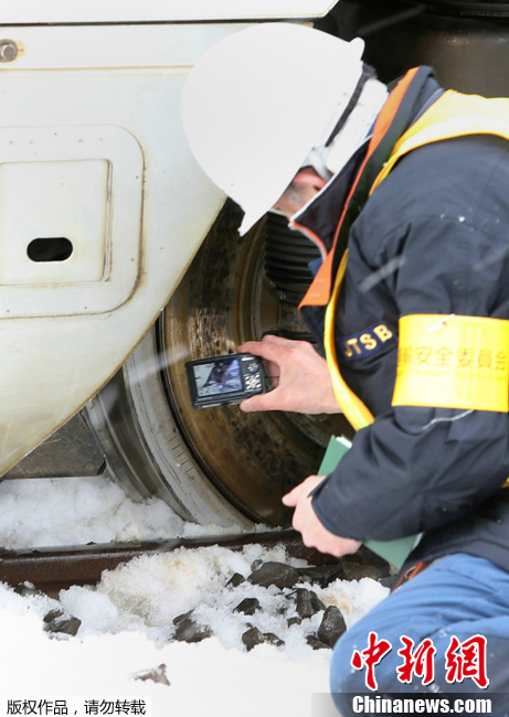 当地时间2013年3月3日,日本秋田Daisen,调查人员检查脱轨高速列车的车轮。日本一列载有大约130名乘客和乘务人员的高速子弹头列车2日在大雪中脱轨,现没有伤亡情况报告。